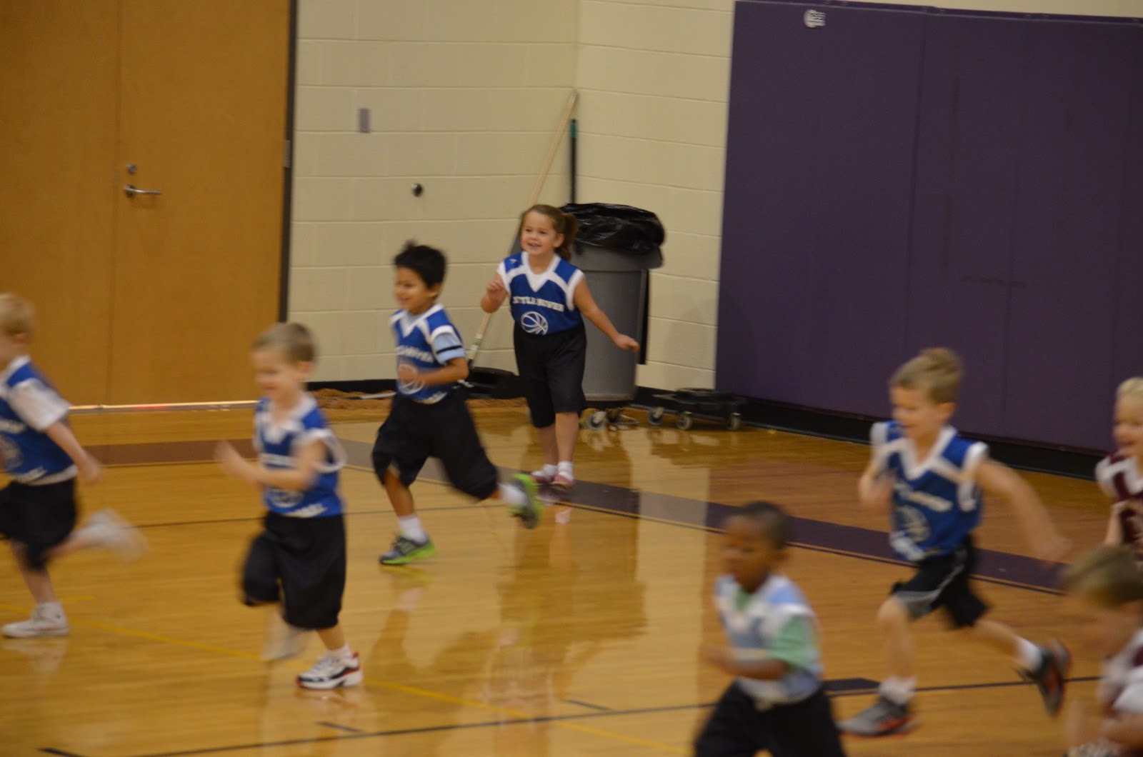 Saturday was her first experience with it. I guess we didn't really think to explain the game of basketball to her ahead of time...she had no clue what was going on. It was cute though. There were 20 kids there, 4 of which were girls. They divided them into 4 teams, by color. Then each coach walked them through 3 drills - shooting, dribbling and guarding. The game only ended up being a few minutes long this time, but we got plenty of pictures.